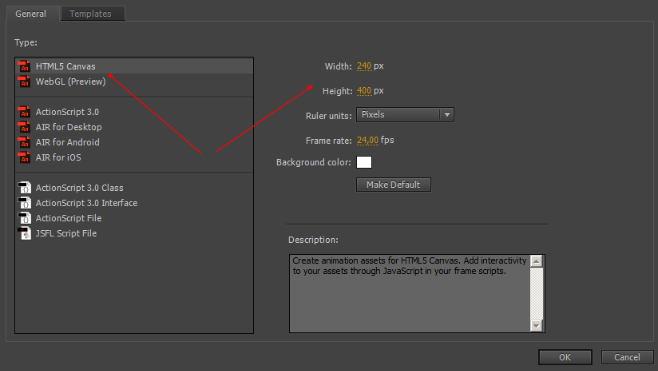 - В появившемся окне во вкладке General в поле Type выбрать тип шаблона рекламного баннера. Предпочтительно выбрать тип HTML5 Canvas;