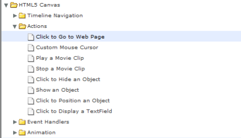 В появившемся окне необходимо выбрать двойным кликом HTML5 Canvas -> Actions -> Click to Go to Web Page.