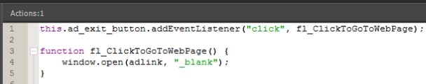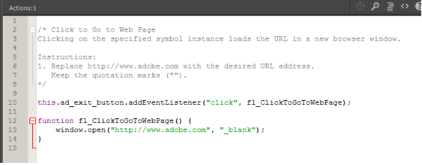 - В появившемся окне нужно удалить комментарии к коду. В функции fl_ClickToGoToWebPage() в команде window.open необходимо изменить адрес на adlink. Adlink должен быть строго без кавычек