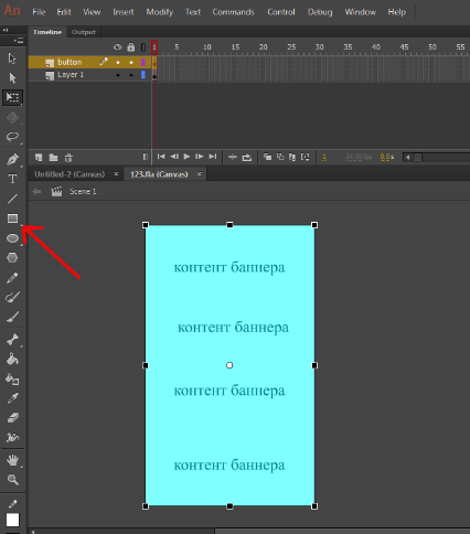 - На панели инструментов выбрать прямоугольник (указано стрелочкой) и поместить на рабочую область баннера.