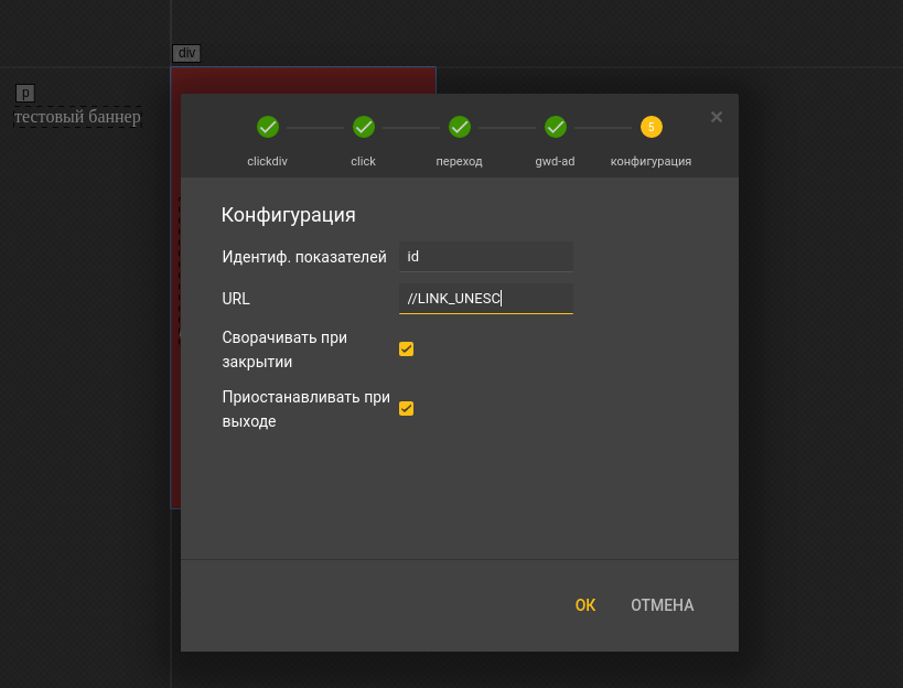 - В пункте Конфигурация заполнить поля Идентиф. показателей, URL и выбрать чекбоксы Сворачивать при закрытии, Приостанавливать при выходе. Затем нажать на кнопку ОК.